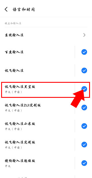 2、在“键盘和输入法”下方找到“讯飞输入法黑鲨版”并点击后方圆圈将其勾选