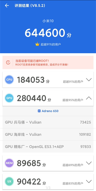 1、首先手机搭载的是骁龙865处理器,其次需要ROOT(小米手机可以)。使用软件前,先用安兔兔跑个分,然后使用时再测试一下,就能看出差距了,例如下面这台搭载865的小米10正常大概在57万分左右,和888差距在14万分。