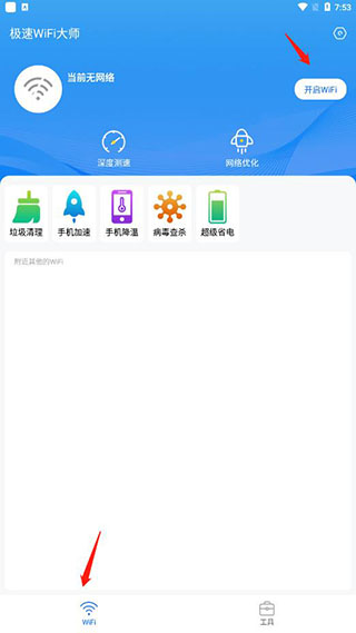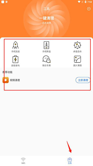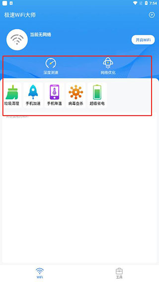 2、另外还可以检测wifi速度,优化网络,还有垃圾清理、手机加速、手机降温、病毒查杀、超级省电等功能;