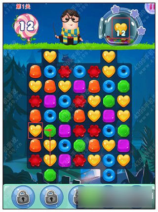 1、下图以第1关为例子,在消除界面中,我们只要将相同的“图形”滑动到相应的位置,即可完成三消。注意:一定要三个相同的图形在同一条直线上面时,才会消除噢。下图中,以消除黄色的爱心为例子。右上角的12个黄色爱心为本关的目标,只有完成消除12个黄色爱心的目标,才能获得本关的三星通关噢。