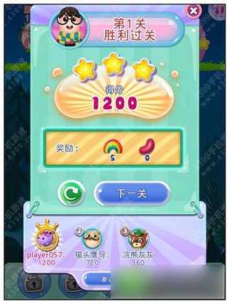 2、过关之后,可以获得相应的奖励和分数,同时可以知道自己是几星通关本关的,小甲第1关如下图,是三星通过的哟。
