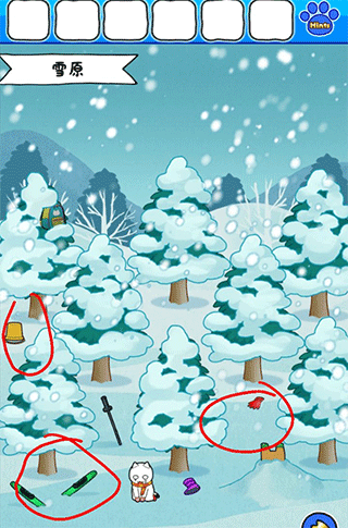 2、利用“铲子”铲开旁边的雪堆,解救猫老大,而猫老大则会将【洞窟前】的雪人推开,解锁新地图~