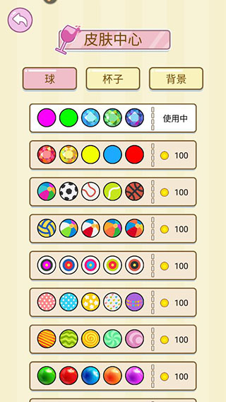 7、返回首页进入皮肤中心,可以购买球、杯子、背景等皮肤,让游戏画面变得更好看些;