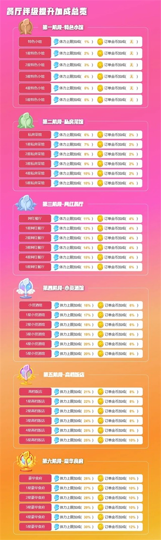每当评级提升,各位店长的餐厅即可永久享受不同的等级加成,不同的餐厅等级加成如下~