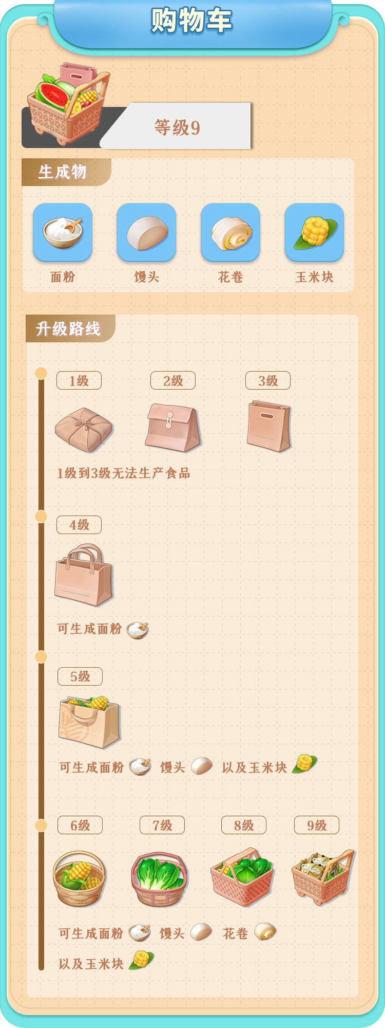 纸包-大纸包-纸袋-手提袋(可生产面粉)-购物袋(可生产面粉、玉米)-购物篮(可生产面粉、馒头、花卷、玉米)-竹编购物篮-精致购物篮-购物车-购物车(满级10级)