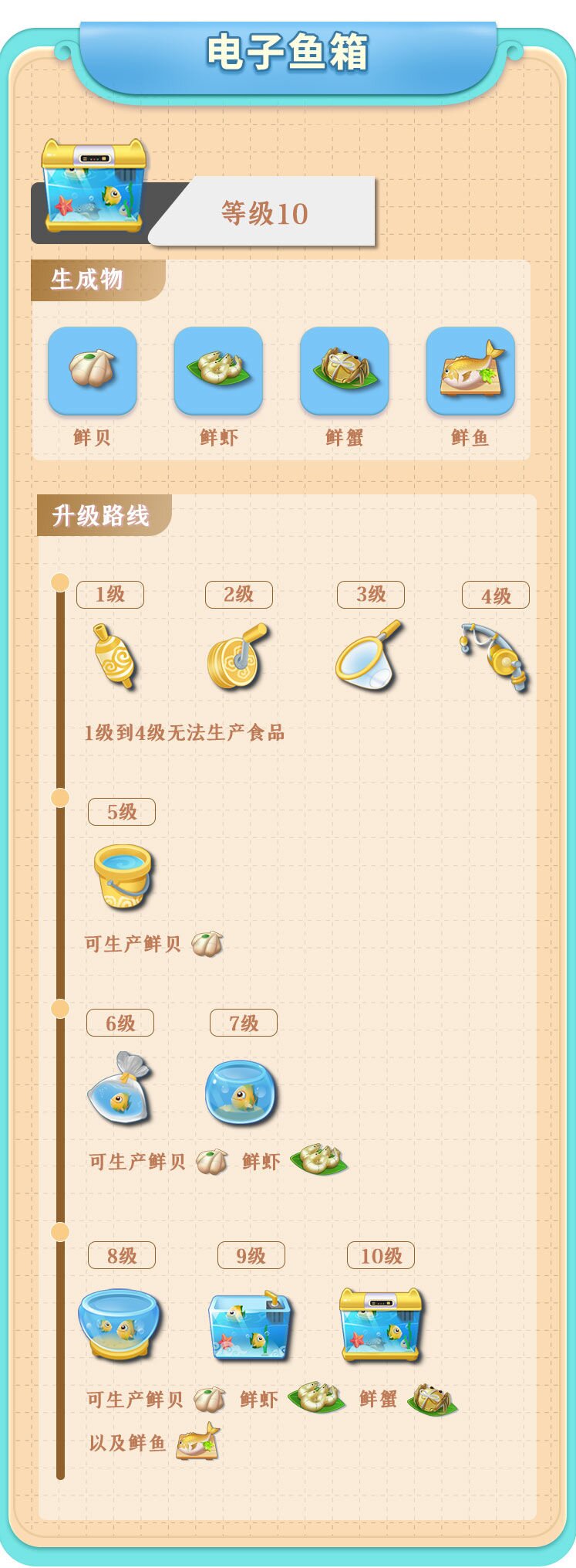 渔线-放线器-渔网-鱼竿-渔桶(可生产鲜贝)-鱼袋(可生产鲜贝与鲜虾)-小鱼缸-鱼缸(可生产鲜贝、鲜虾、鲜蟹)-鱼箱-电子鱼箱(可生产鲜贝、鲜虾、鲜蟹、鲜鱼)满级10级