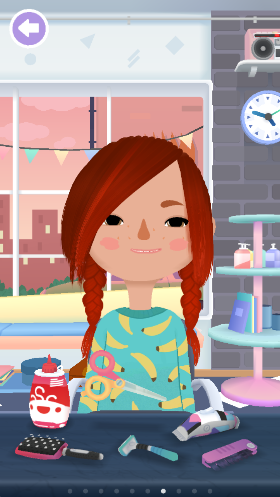 3、在这里有很多的场景,玩家可以进行左右滑动,默认的话是进入下图这个页面,当人物坐好之后,就可以修剪她的发型,弄成自己喜欢的样子;桌上的物品都是可以使用的;