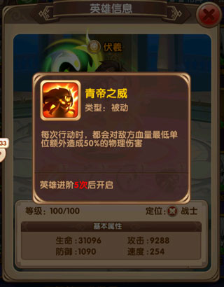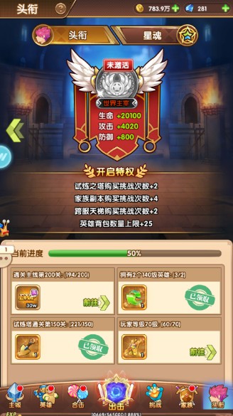 达到指定条件后激活,加全体上阵英雄的属性,并且增加各种玩法的挑战次数(图标幸好不是绿色的,策划保留了最后的一点人性)
