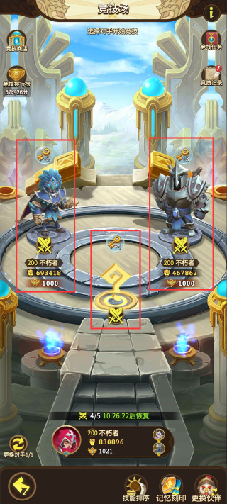 玩家每天都可以参与竞技场战斗,每次参赛时,玩家可以在随机两名对手(可看到排名和战力)和一名随机对手(任何信息都为问号)中挑选一名进行挑战。