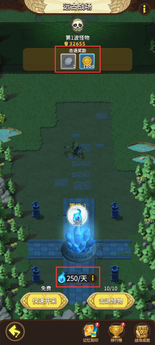 远古战场的玩法与“塔防”类似,玩家需要在有限的时间内击退敌人,且守护的水晶生命值不能掉到0。设置好刻印后即可开始击退怪物守护水晶,击退怪物后可以获得一定奖励,每日可击退10次怪物,随着击退怪物次数增多,辐光原矿的等级会逐步提升,每日产出的辐光原石产量也会增多。(辐光原石是提升神器灌注等级的重要材料)