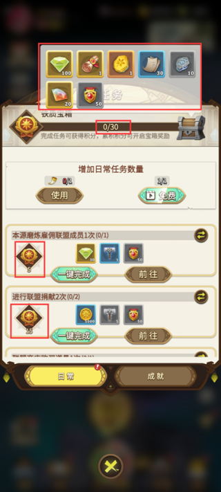 首先需要了解的是,日常任务的每日更新数量与不朽荣耀等级有关,起始状态为每日刷新3个普通任务+1个联盟任务,随着不朽荣耀等级提升,会增加每日任务刷新数量(也可通过看广告增加1个任务)。另外,日常任务可以单个刷新,免费刷新次数同样受不朽荣耀特权等级影响。