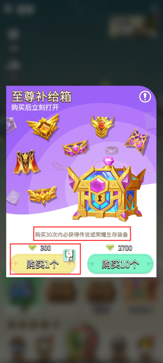 ③生存玩法的至尊补给箱也可每日看广告获得一个,价值300钻石,开启可获得生存装备,累计抽取30次内必定获得一件传说及以上品质的生存装备。