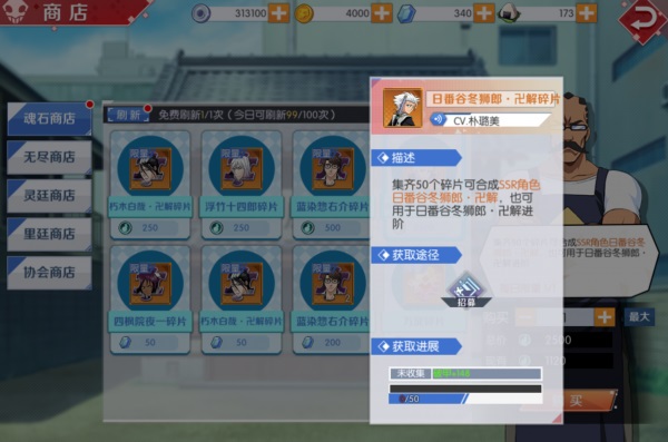 3、还有就是商店了,商店中玩家可以根据自己需求来自行购买自己需要的碎片,普通的碎片能够直接合出人物,卍解碎片能够合出卍解后的人物,也可以用于进阶,同时碎片还可以从各种活动以及剧情中获得。