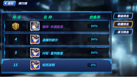 在收藏排名里可以看到各位机长的机师、机甲收藏排名,以及当前收集率的数字。每个机长都可以看到自己在榜单里的排名。