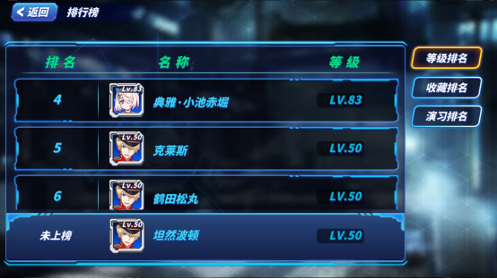【等级排名】首先,在排行榜里可以看到各个主角的等级排名,以及自己的榜上排名,知己知彼才能不断学习和进步。
