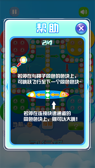 4、若停在与棋子同色的色块上,可跳跃飞行至下一个同色色块~若停在连接快速通道的同色色块上,则可以大跳!