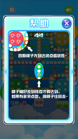 6、四颗棋子先到达终点者获胜~棋子刚好走到终点才算达到,如果有多余点数,则棋子往回走~