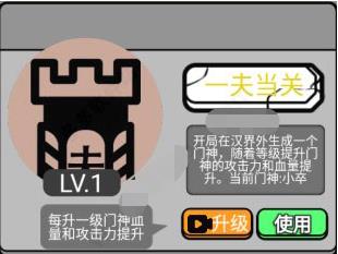 开局在汉界外生成一个门神,随着等级提升,门神的攻击力和血量也提升,每升一级门神血量和攻击都会提升