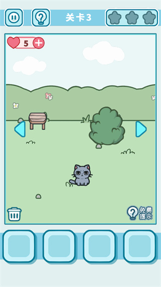 5、第5关这关一定要快!!!先去左边场景获取到飞镖、蝴蝶、草丛,然后等待一会气球飞来用飞镖将气球射爆获取到星星,再等一会会有第二个气球飞来,最后一颗星星在右边场景,点击木椅旁边的草丛即可完成收集3星,最后将草丛使用在猫咪上,在中间点击大草丛选择躲藏即可。