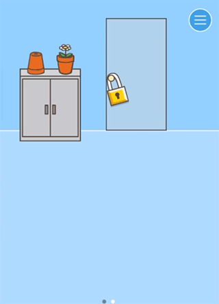 办公桌上拿到第一个晴天娃娃,在滑到右边,柜子里拿到锤子,到办公室敲碎裂缝,拿到第二个娃娃。到最右边把两个都挂上去,在点两个娃娃让它们倒过来。到办公室,打开窗户,拿到娃娃后到最右边挂上一样倒过来。最后回到办公室,老板假发会掉下来,拿钥匙。