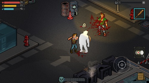 1、进入游戏后,我们会在地上捡到一根棒球棍,这就是我们的初始武器了,直接点击屏幕左下角的攻击按钮就能自动攻击自己身边的僵尸。