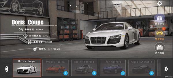 2、在车库中选择喜爱的豪车,点击按钮展开独特的驾驶之旅;