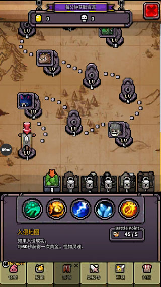 1 、选择10种魔法技能中的5种来结合自己的技能。2、从入侵地图中获取怪物地图,并在书中注册更强大的怪物。