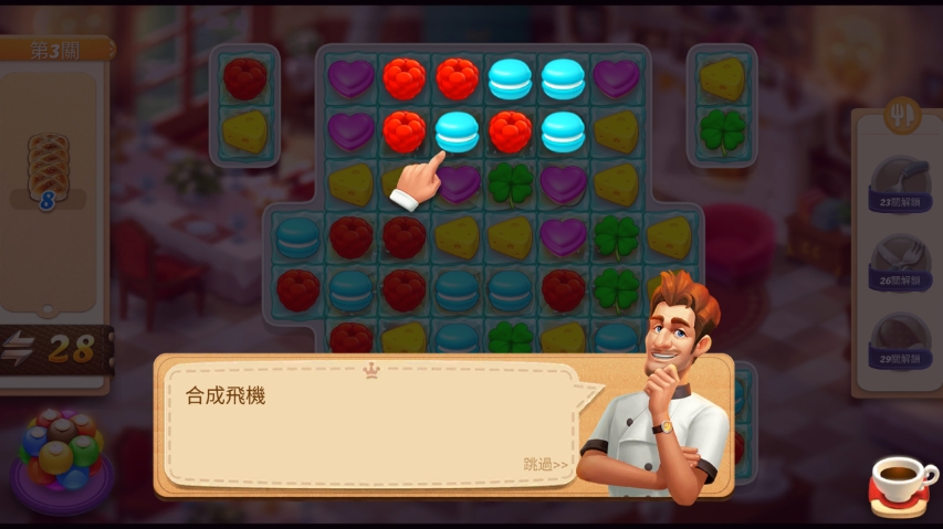 特别是纸飞机的新玩法,听起来挺有趣的,把四个同样颜色的方块变成纸飞机,感觉比普通的三消更有创意。不过我有点担心操作会不会复杂,毕竟得同时兼顾消除和餐厅经营两部分。