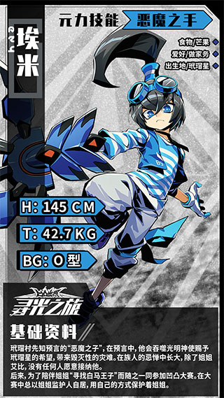 埃米,玳瑁村先知预言的“恶魔之子”,在预言中,他会吞噬光明神使赐予玳瑁星的希望,带来毁灭性的灾难。在族人的忌惮中长大,除了姐姐艾比,没有任何人愿意接纳他。