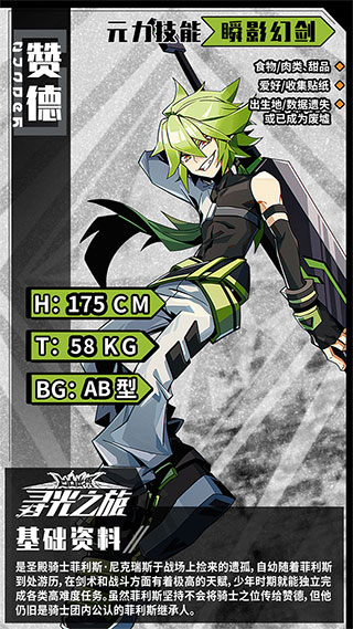 赞德,是圣殿骑士菲利斯·尼克瑞斯于战场上捡来的遗孤,自幼随着菲利斯到处游历,在剑术和战斗方面有着极高的天赋,少年时期就能独立完成各类高难度任务。虽然菲利斯坚持不会将骑士之位传给赞德,但他仍旧是骑士团内公认的菲利斯继承人。