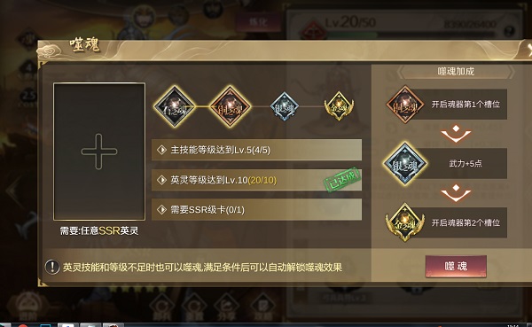 噬魂:英灵殿等级的提升在达到5级10级20级的时候分别可以进行三次噬魂,等级达到5级,主技能等级2级时消耗一张R卡可进行噬魂;等级达到10级时,主技能等级5级用一张和本英灵同等级的卡作为材料,方可噬魂;等级20级,主技能等级10级用一张和本英灵同等级的卡作为材料方可噬魂。噬魂开启魂器佩戴,可大大提升战斗胜利。