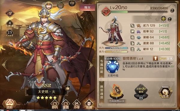 兵力:英灵基础可携带兵力100人,每升一级上限增加100,可通过出征、扫荡等方式使英灵升级,建造和升级兵营,激活英灵宿命都可以增加兵力。