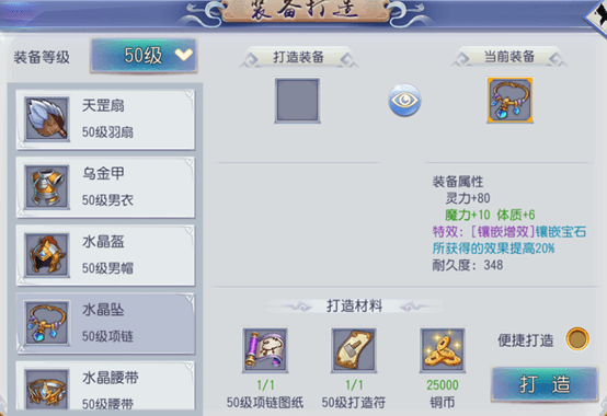 打造装备需要用到三样东西:打造图纸、打造符和铜币。打造图纸可以直接通过商会购买、活动、藏宝图产出;打造符则是通过摆摊购买或者通过自己的生活技能制作。当然还要便捷打造的方式,直接消耗元宝(土豪推荐)最高可打造比自身高一个层次的装备。