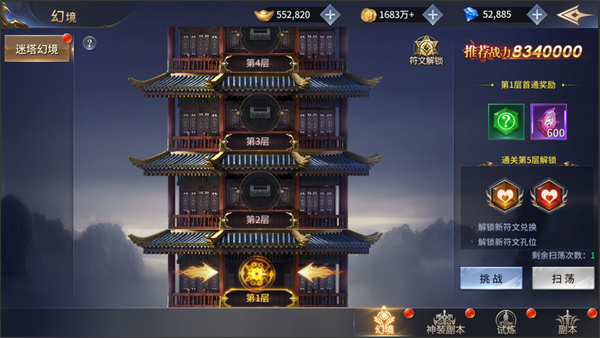 - 迷塔幻境为爬塔玩法,通关上一层后即可进入下一层;