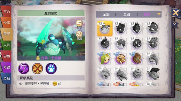 可打开冒险之书-魔灵界面,详细查看每一个魔灵的属性介绍和获取方式。