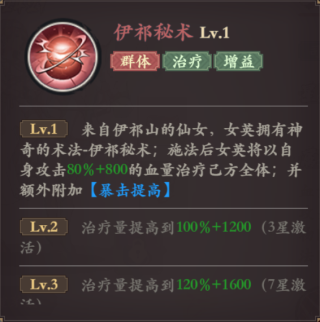 女英在怒气满后可以释放大招,以自身攻击力加固定血量治疗己方全体,并额外提高己方15%的暴击率