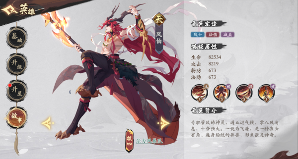 角色背景:专职管风的神灵,通五运气候,掌八风消息,十分强大。一说为飞廉,是一种雀头有角、鹿身豹纹的异兽,形象很是神奇。