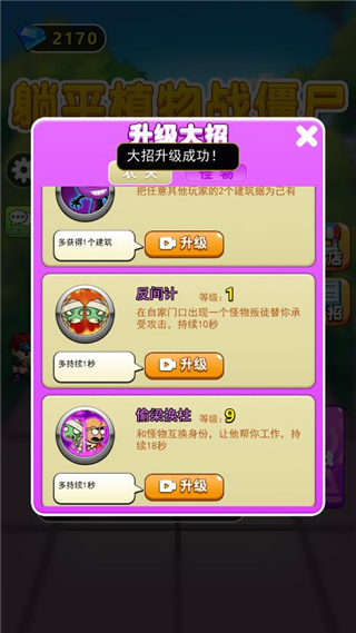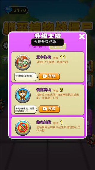 躺平植物战僵尸(大招版)原名为“别惹农夫”,游戏凭借着《植物大战僵尸》的元素和《猛鬼宿舍》的玩法,深受很多玩家的喜爱,该作采用了经典的卡通游戏风格,将僵尸、植物、道具等等游戏内容,设计的十分呆萌,再搭配上非常轻快愉悦的游戏音效,为玩家们带来了一场全新的塔防策略游戏。在这里,玩家需要从两个阵营中选择自己想体验的,分别是:守护方农夫“戴夫”、攻击方僵尸,两者相比之下,大多数玩家都是选择扮演农夫,因为这样才更加具有乐趣,玩家进入游戏后,需要找到一个空的房间,通过不断耕地来获取阳光,然后再将自己获得的阳光去购买放置各种各样的植物,以此有效的阻止并消灭入侵的僵尸。躺平植物战僵尸游戏如何升级大招