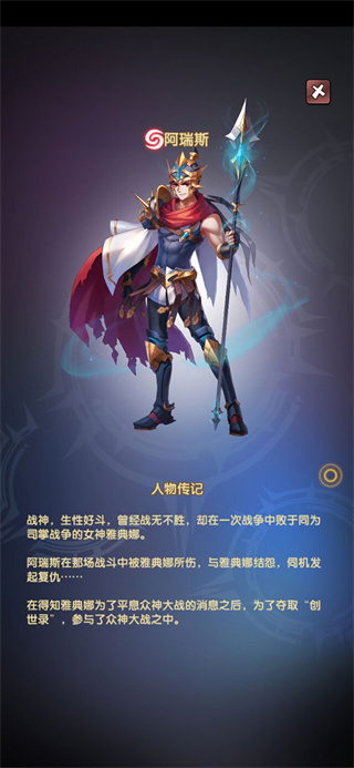 阿瑞斯受到攻击时,70%概率为自身施加1层【战神之力】效果;叠加到5层时,消耗全部的【战神之力】,使敌方全体受到阿瑞斯攻击力100%的真实伤害