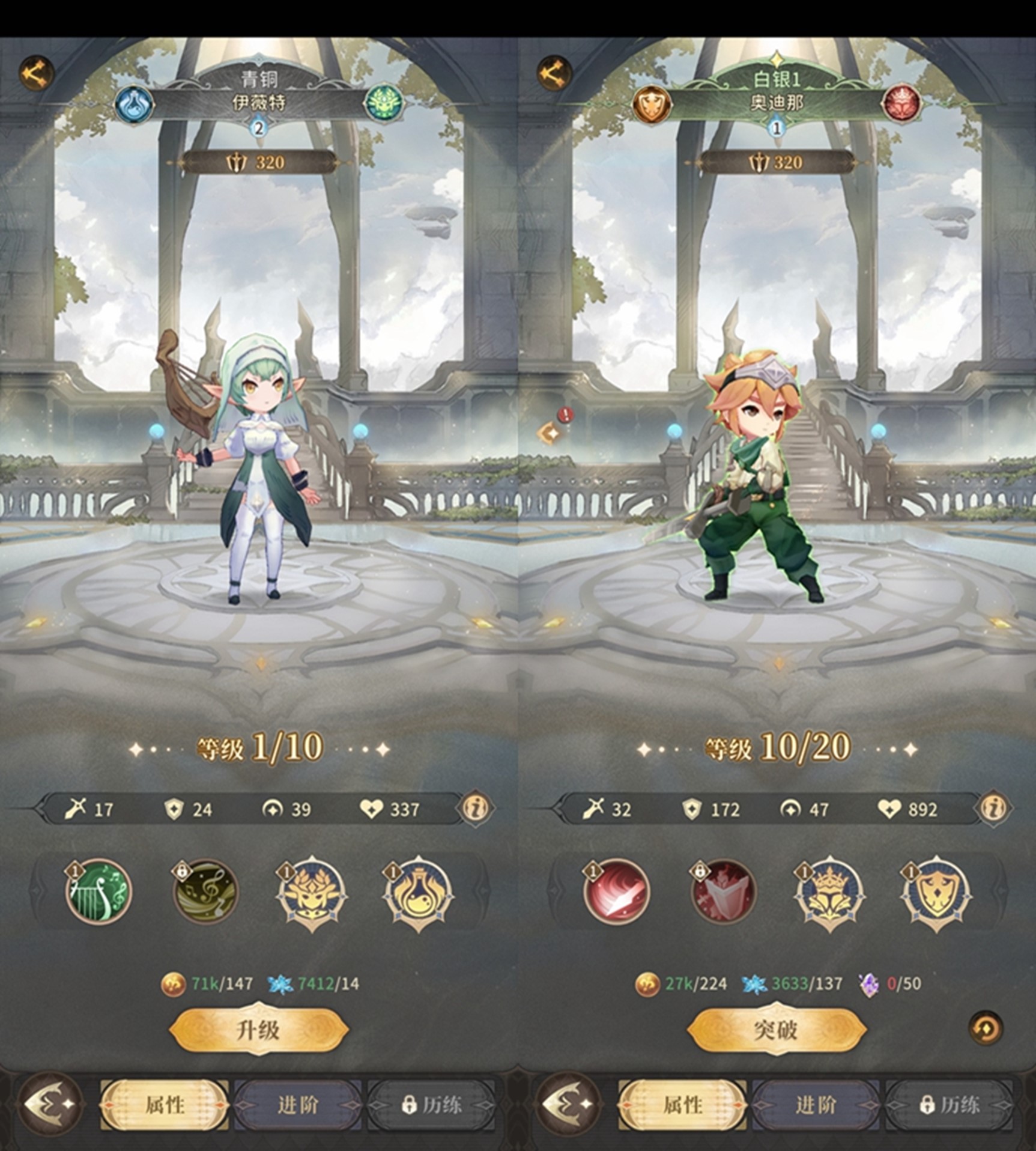 当我们在成员大厅召集到相同品阶的成员时,就可以使用成员页面中的进阶功能,让两个相同品阶的成员进行合成进阶,成员品阶从青铜、白银、黄金、铂金、钻石、圣域、传奇、半神一共分了八个品阶,每个品阶需要进阶的次数也会增加,前文提到的成员等级上限也取决于成员的品阶。进阶也可以通过在召集大厅拖动相同品阶的成员完成,在手动拖拽30次进阶之后,我们还可以解锁“一键进阶”功能,非常方便。品阶提升之后,角色的基础属性会有一个质的飞跃,如果在冒险中卡关了,不妨试试成员召集提升队伍中成员的品阶吧!