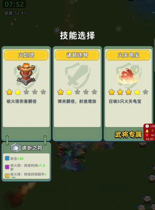 推荐第一个技能选择八卦阵,其他技能有一定的CD时间,要么就是不能持续发射,不能很好应对源源不断生成的敌人,没有选择八卦阵的主公就需要灵活的走位来弥补技能的空档期了,后期就慢慢根据技能组合升级即可。