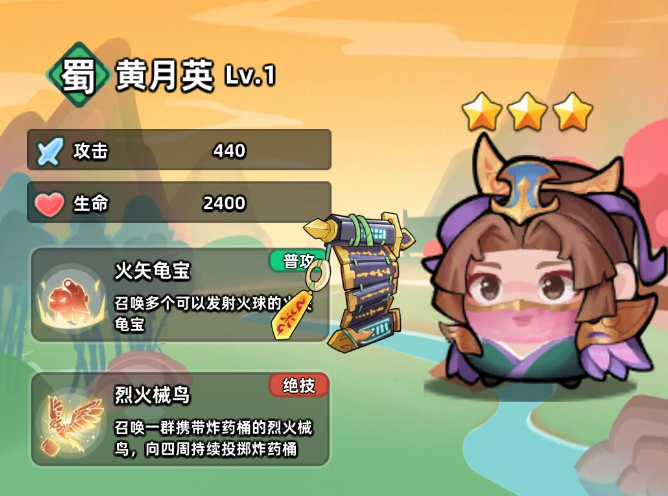 召唤越多,割草越快!黄月英是众多武将中唯一一个会使用召唤术的武将,普攻能召唤多个发射火球的火矢龟宝;绝技能召唤一群携带炸药桶的烈火械鸟,想四周持续投掷炸药桶。