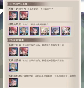 执念:分为朱雀(红色),玄武(黄色),青龙(绿色),白虎(蓝色)四大类别,执念卡升星一般会带来各种效果加成(修炼效果增加,修炼消耗减少,修炼的成功概率提高,增加弟子初始属性)。