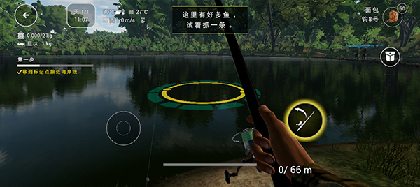 4、右边的按钮是抛竿,寻找到合适位置后点击此键抛竿即可。