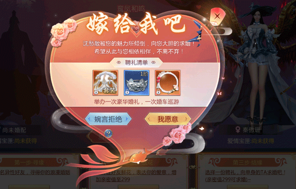被提亲对象收到提亲申请后,可打开求婚面板,然后10分钟内可选择【我愿意】或【婉言拒绝】;