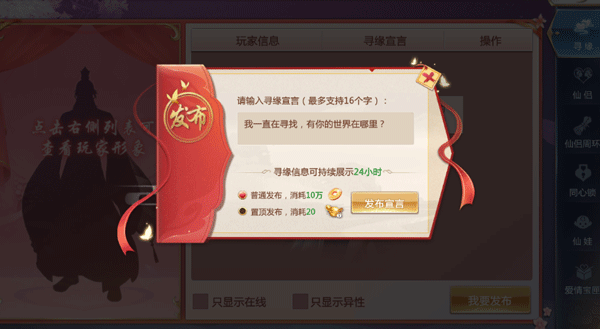 1、寻缘,添加一名好友,也可以在寻缘大厅通过消耗铜钱或者绑元发布寻缘宣言