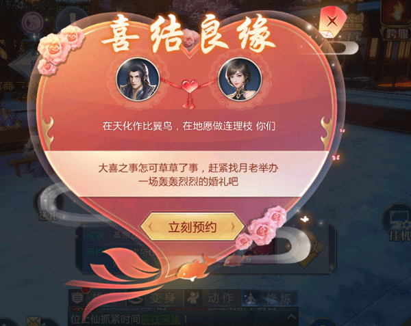 当对方答应求婚后,可在仙侣界面选择预约婚礼,预约婚礼要选择婚礼举行的时间;