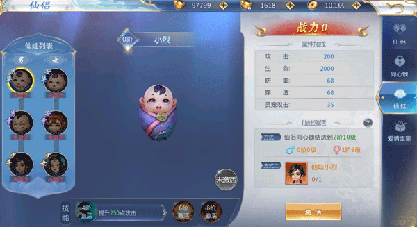 3、激活后的仙娃可消耗爱情结晶进阶,获得大量属性;孩童以上的仙娃和灵宠可以同时出战,但是与战宠出战互斥;