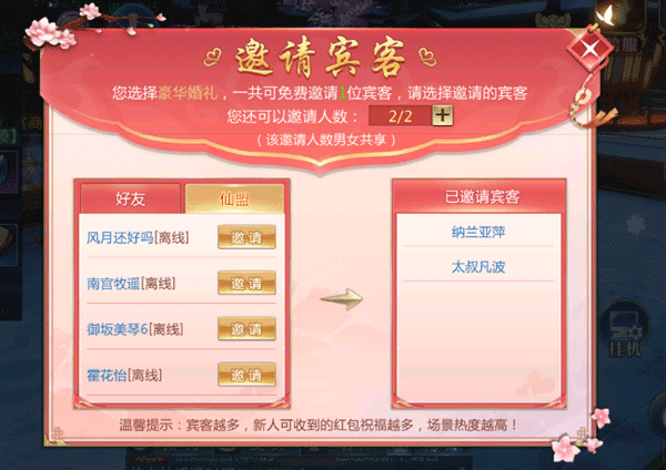 预约婚礼后,可在仙侣界面选择邀请宾客,被邀请的宾客会收到请帖;