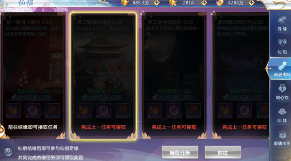 2、进行仙侣结缘后即可进行仙侣奇缘,当仙侣双方均完成同一组任务后,即可领取该组奇缘任务奖励,并激活下一组任务;任务进度每周一5点刷新;